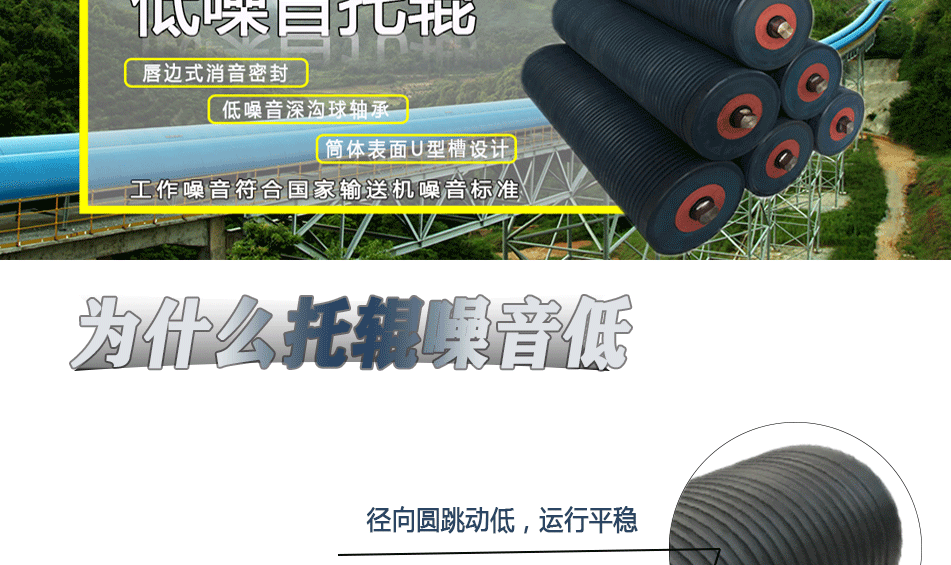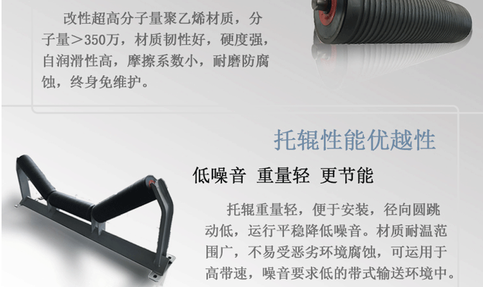 产品简介: FJS-JY低噪音托辊,其管体选用优质改性超高分子量聚乙烯(UHMW-PE)主材料,通过良好的生产加工工艺,使动平衡等级达到G16(ISO1940)标准,运行平稳,U型通风槽精细加工,减少与皮带的摩擦。结合华北塑料公司自主研发的唇边式消音密封,使带式输送机的噪音降到(达到)国家标准GB12348以下。